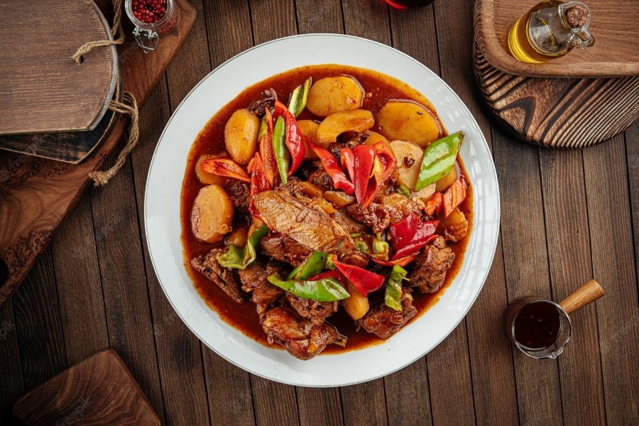 Súp gà hầm Tân Cương là một trong những món ăn hàng đầu của nhiều du khách muốn trải nghiệm ẩm thực của Tân Cương. Tên Trung Quốc của món ăn này là “Dapanji” mang ý nghĩa là gà nguyên con, gồm có một đĩa lớn khoai tây, ớt, gà nguyên con và nhiều gia vị khác. Đây là món ăn bạn nên ăn theo nhóm, vì vậy hãy tìm khoảng 4 đến 5 người bạn địa phương hoặc ăn cùng những người bạn trong chuyến hành trình của bạn vì món súp gà hầm này rất nhiều đồ ăn và giá của món ăn này cũng khá đắt nếu chỉ có một người ăn.