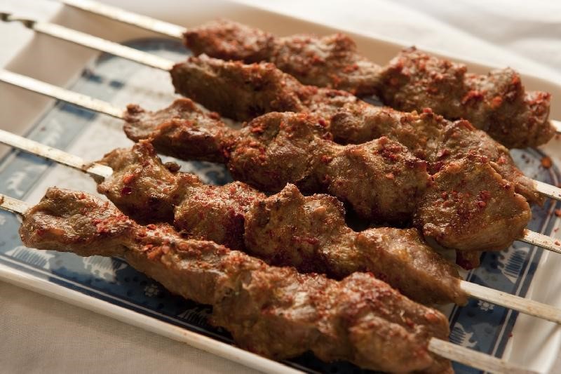 Đây được coi là một trong những món ăn đường phố không thể bỏ qua khi du lịch Tân Cương. Thịt thường là thịt cừu được xiên vào tăm tre tẩm gia vị và ớt bột, sau đó nướng trên bếp than hồng, mùi thơm phảng phất khắp cả khu phố khiến thực khách khó thể nào cưỡng lại sự thèm ăn. Khi dạo quanh các con phố mùi hương thịt nướng sẽ tỏa ra từ khắp nơi để quyến rũ bất kì một ai, nên dù có đang trong chế độ ăn kiêng đi chăng nữa thì du khách cũng thật khó mà từ chối món ăn hấp dẫn này!