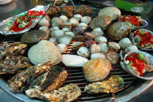 Có nhiều loại để bạn lựa chọn như: nghêu, sò, ốc…Tất cả đều được ướp đầy đủ gia vị với một vài thành phần chính như nước sốt bơ, hành, tỏi, ớt,.. các món ăn thơm hương, cay nồng và nóng hổi sẽ rất thích hợp với khí hậu lạnh của xứ Hàn. Bạn có thể được trải nghiệm tự mình nướng và thưởng thức cùng bạn bè khi du lịch Hàn Quốc.