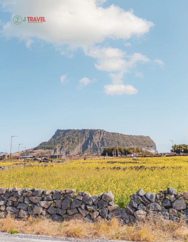 Mùa xuân ở đây có hoa cải dầu nở rộ xung quanh Làng Seongsan-eup đường Ilchul-ro và Bãi biển Gwangchigi. Một màu vàng tươi nhuộm thắm cả một vùng trời. Đây là bức tranh mùa xuân vô cùng tuyệt mỹ mà thiên nhiên ban tặng cho hòn đảo xinh đẹp này. Một bức ảnh đẹp sẽ trở thành kỷ niệm cho bạn với Đỉnh Seongsan Ilchulbong cao vút nằm sừng sững trên mặt biển, hiện diện hùng vĩ đầy kiêu hãnh kết hợp với bầu trời Jeju trong xanh.