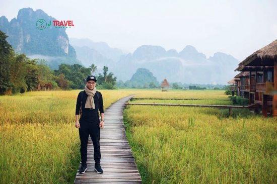Cách thủ đô Vientiane 150km, Vang Vieng Nằm yên bình bên vách núi với khung cảnh thiên nhiên thơ mộng, hữu tình. Một vùng nông thôn thanh bình, trù phú với những mái nhà tranh năm lẩn khuất dưới những tán cây xanh mát. Phía trước là dòng sông êm trôi và chiếc cầu nhỏ bắc ngang qua dẫn thẳng vào thị trấn. Bạn có thể đến đây du lịch Lào Tết dương lịch 2023 kết hợp nghỉ dưỡng, hít thở không khí trong lành.