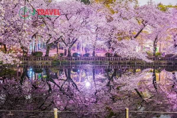 Du lịch Nhật Bản mùa xuân bạn sẽ được chiêm ngưỡng sắc hoa từ 500 cây anh đào ở công viên này. Khi hoa anh đào nở rộ, bạn có thể chèo thuyền trong ao, tận hưởng cảm giác được bao bọc trong màu hồng lãng mạn của hàng cây anh đào.
