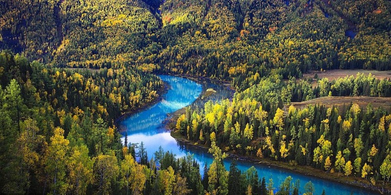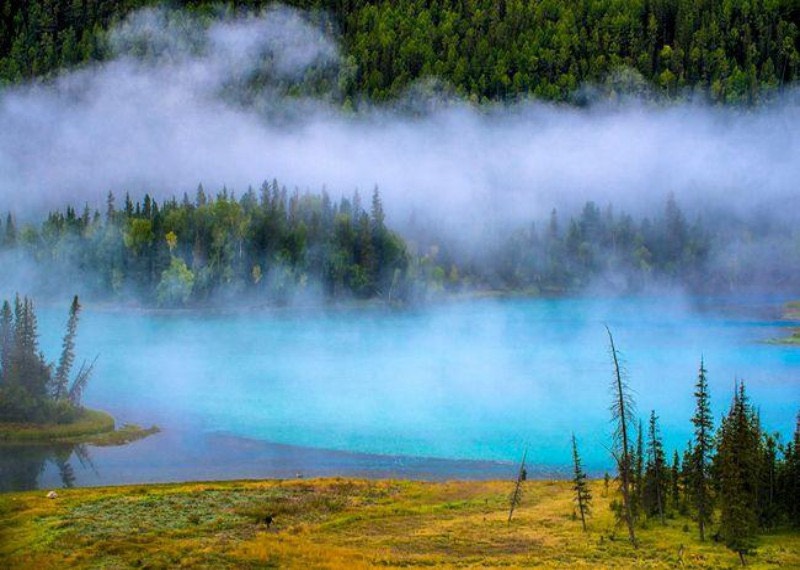 Hồ Kanas ở thung lũng dãy núi Altai, Altay, góc phía bắc Tân Cương, là một trong những điểm đến quyến rũ và hàng đầu ở Tân Cương. Khu danh lam thắng cảnh, được biết đến nhiều nhất với Quái vật hồ Kanas, tự hào có cảnh quan thiên nhiên đẹp như chốn thần tiên đáng kinh ngạc: hồ nước màu xanh ngọc chảy qua những khu rừng rậm xanh mướt phủ kín những đỉnh núi, những ngọn núi tuyết sừng sững phía xa, hồ sương mù với những cây bạch dương mùa thu đầy màu sắc tạo thành một bức tranh màu nước và sự thanh bình những ngôi nhà gỗ và lối sống cổ xưa được bảo tồn tốt ở các làng Tuva.