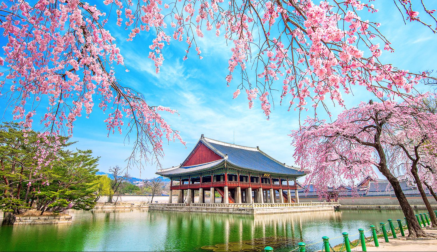 Cung Cảnh phúc (Gyeongbokgung) là một địa điểm thu hút khách du lịch vào tất cả các mùa. Vào mùa xuân, các tòa nhà cổ kính cùng với những cây anh đào sắc hồng, trắng tạo nên khung cảnh quyến rũ. Khi đến cung, bạn có thể chọn cho mình một bộ Hanbok và chụp hình dưới các cây hoa anh đào.