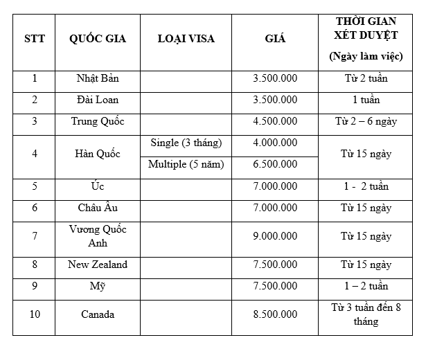 J VISA với dịch vụ tư vấn miễn phí 24/24, sẵn sàng hỗ trợ bạn thủ tục xin visa theo chuẩn yêu cầu từ ĐSQ. Hãy liên hệ ngay để được tư vấn và giải đáp mọi thắc mắc: 0909 977 729 (Ms.Thảo) – 0919 556 305 (Ms. Thuý). Dưới đây là bảng giá Visa của J Travel mời bạn tham khảo: