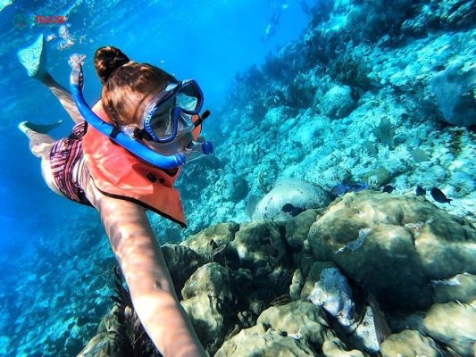 Phía đông bắc hòn đảo có rạn san hô là nơi lặn biển ấn tượng với nhiều hang động lớn, phần nhô ra đẹp mắt, hùng vĩ.