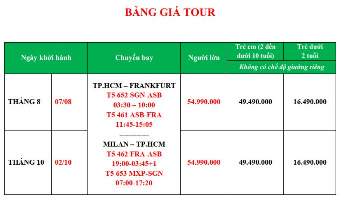 Lưu ý: Trong trường hợp chỉ có 1 khách (người lớn) đi với 1 trẻ em dưới 10 tuổi (không có chế độ giường riêng), Quý Khách vui lòng thanh toán thêm để bé có chế độ giường riêng. Hai người lớn đi kèm một trẻ em, trẻ thứ 2 trở đi thanh toán bằng giá tour người lớn.