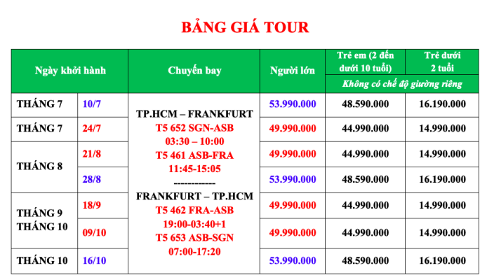 - Lưu ý: Trong trường hợp chỉ có 1 khách (người lớn) đi với 1 trẻ em dưới 11 tuổi (không có chế độ giường riêng), Quý Khách vui lòng thanh toán thêm để bé có chế độ giường riêng. Hai người lớn đi kèm một trẻ em, trẻ thứ 2 trở đi thanh toán bằng giá tour người lớn.