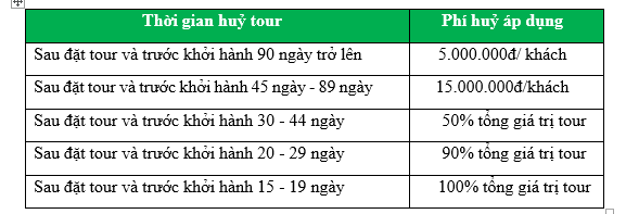 *Phí hủy tour áp dụng trong mọi trường hợp khi khách hàng chủ động yêu cầu hủy tour (mọi trường hợp liên quan đến việc nhiễm COVID-19 hoặc thông báo chưa tiêm đủ vaccine,…. đều không được chấp nhận)