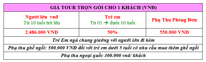 - Từ 10 tuổi trở lên: giá tour như người lớn.