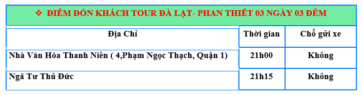 Tối: 20h30, Xe và Hướng dẫn viên của đón quý khách tại điểm hẹn, sắp xếp hành lý, gửi lời chào thân ái và kính chúc sức khỏe đến quý khách. Bắt đầu hành trình Tour ĐÀ LẠT – PHAN THIẾT – LÂU ĐÀI RƯỢU VANG 3 NGÀY 3 ĐÊM. Quý khách nghỉ đêm trên xe.