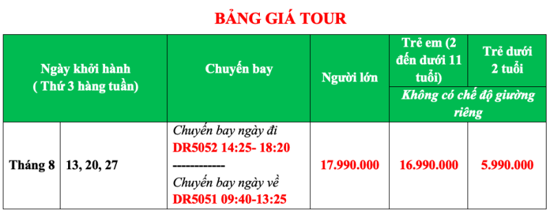 - Trẻ em đủ 11 tuổi trở lên: 100% giá tour người lớn