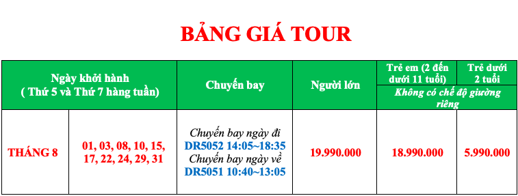 Lưu ý : Thứ tự các điểm tham quan có thể hoán đổi theo tình hình thực tế của thời tiết, giao thông, giờ bay của hãng hàng không … nhưng vẫn đảm bảo đầy đủ điểm trong chương trình!