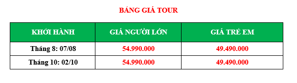 - Tiền TIP cho hướng dẫn viên và tài xế địa phương: 2.000.000 VND/ Khách (đóng tại Việt Nam chung với tour).