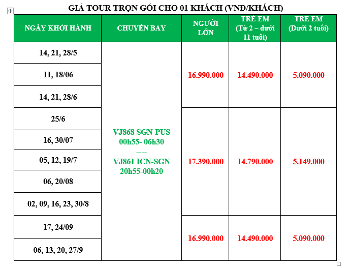 - Vé máy bay khứ hồi theo đúng chương trình của hãng hàng không VN/VJ (SGN-PUS-ICN-SGN)