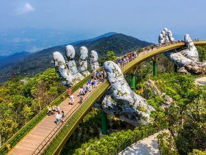 - Kết thúc tuyến cáp treo, HDV sẽ đưa đoàn tham quan điểm đầu tiên Cầu Vàng, được nâng đỡ bởi hai bàn tay khổng lồ tại Bà Nà Hills đang là địa điểm checkin nổi tiếng nhất hiện nay.