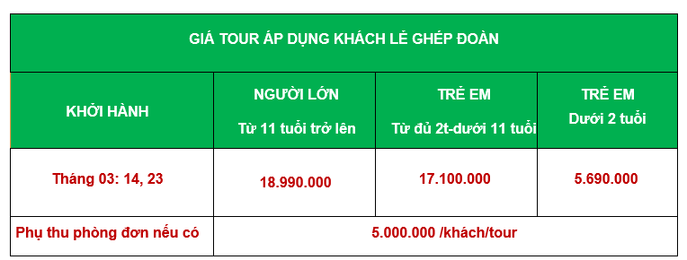 - Chi phí nghỉ phòng đơn (nếu có) 000.000đ/khách/tour (nếu khách có nhu cầu ngủ 1 mình 1 phòng suốt tour)
