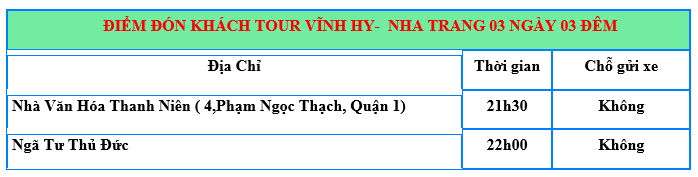 Tối: Xe và Hướng dẫn viên đón quý khách tại điểm hẹn, sắp xếp hành lý, gửi lời chào thân ái tới Quý khách. Xe khởi hành, bắt đầu hành trình Tour VĨNH HY – NHA TRANG 3 ngày 3 đêm. Quý khách nghỉ ngơi trên xe.