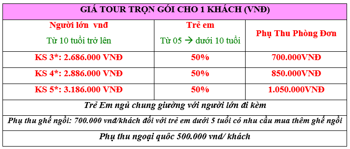 - Từ 10 tuổi trở lên: giá tour như người lớn.